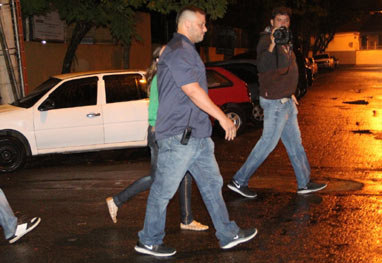 Em frente à delegacia, fãs acompanharam a cena do homem deixando o local tentando esconder o rosto.